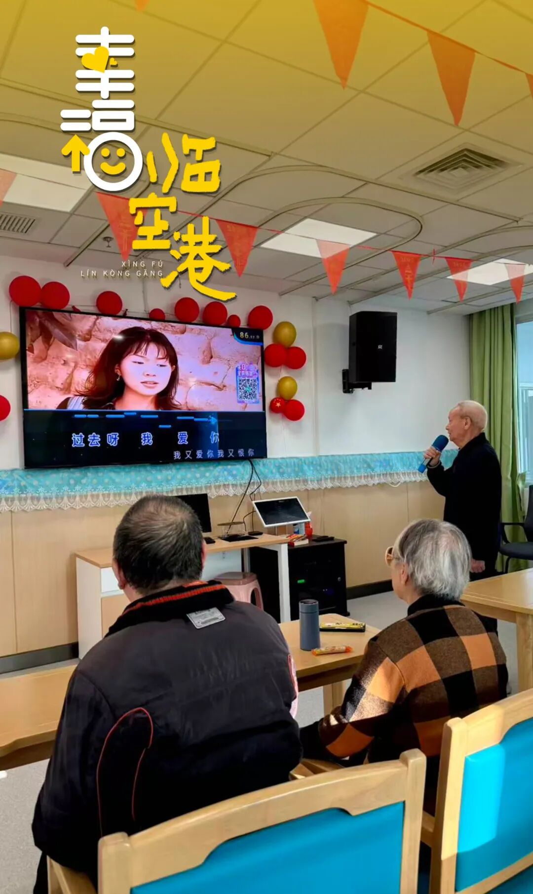 护工陪着老人,跟着节奏投入地唱着歌。