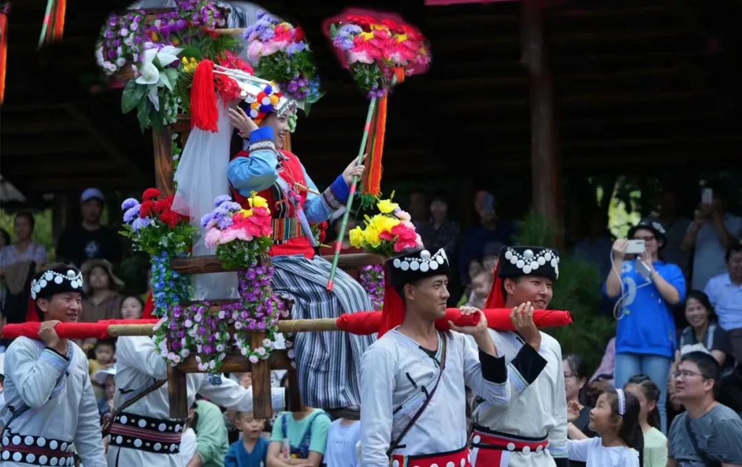 作为少数民族中最为热闹的婚俗环节——摇轿,阿妹稳坐于椅轿之上,众人抬后故意摇晃,引得众人皆笑,喜庆热闹又好玩。