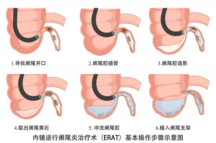 ERAT (内镜下逆行阑尾炎治疗术):通过结肠镜插入至回盲部,通过在内镜下诊断有无阑尾炎,并在内镜下进行插管,冲洗,网篮或球囊取出粪石、支架扩张狭窄阑尾腔、引流脓液等多种方式,达到治愈阑尾炎的一种方法。是一种十分安全、无需开刀、无体表疤、术后恢复快、完整保留阑尾及其功能的微创甚至无创治疗方式。