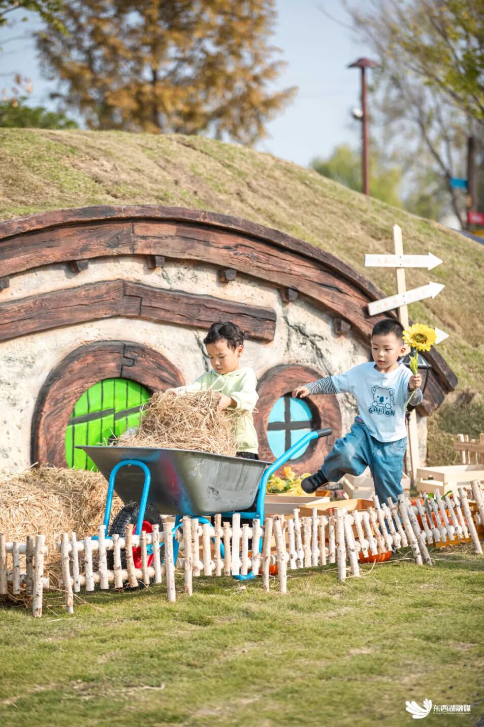 不远处,霍比特小屋静静地坐落在一片绿意之中。屋顶上长满了青草,宛如与大自然融为一体。坐在小屋的房顶上,大人们可以找回那份久违的童真,感受作为一个“大人小孩”的独特乐趣,仿佛时间在这一刻变得缓慢而宁静。
