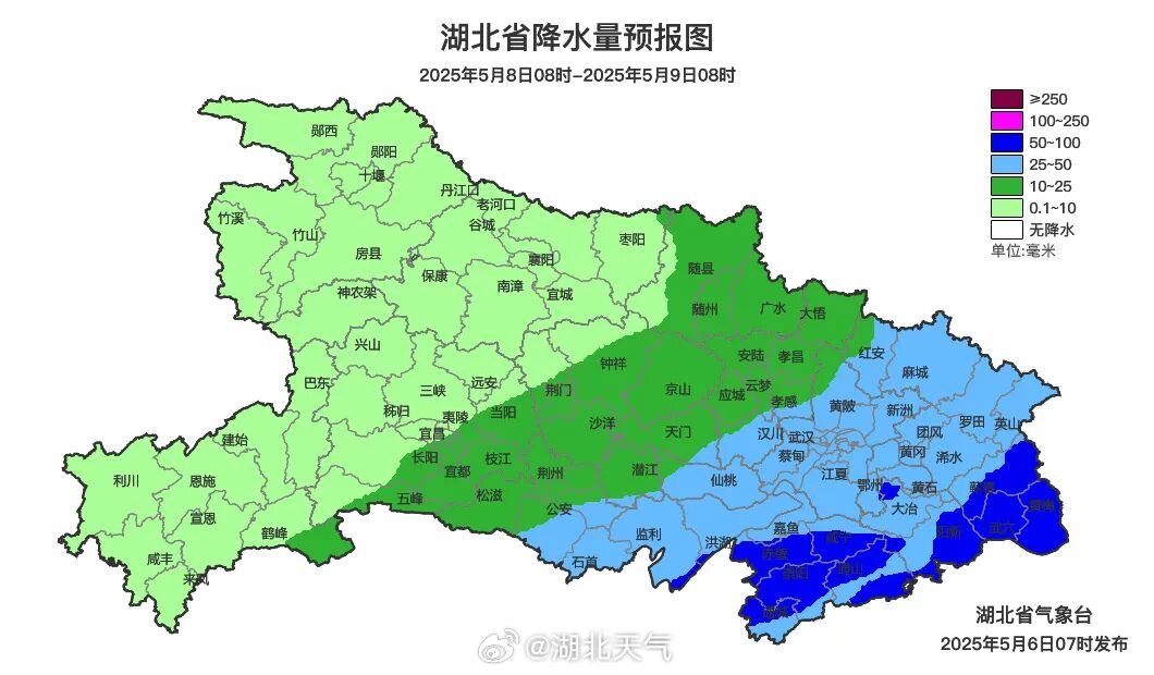 5月7日后半夜至8日白天:阵雨或雷阵雨转中到大雨、局地暴雨并伴有雷暴大风、短时强降水等强对流天气,偏北风3到4级、阵风5到6级,最高气温22~23℃,最低气温 18~19℃。