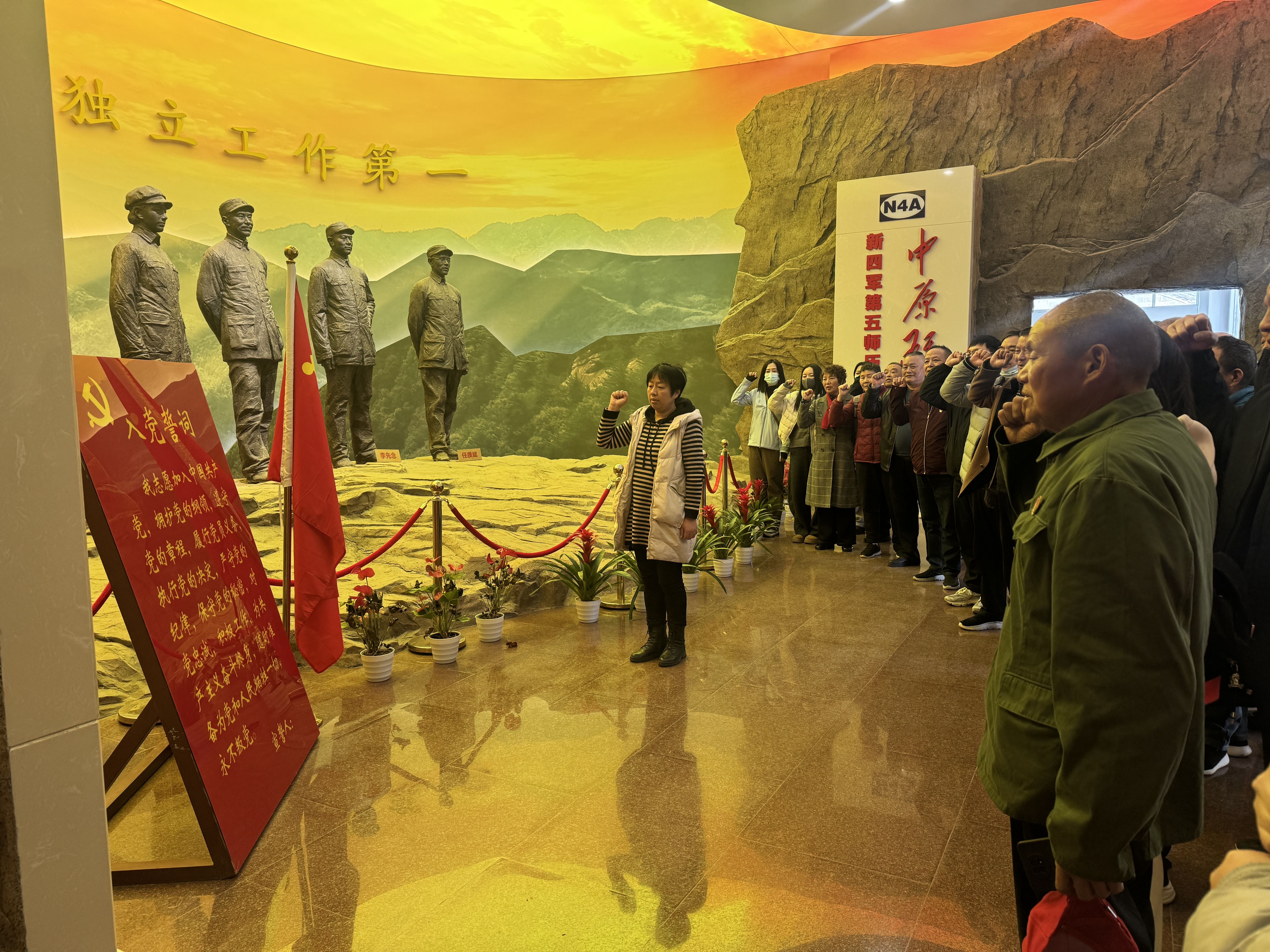 最后,党员队伍转赴芳畈镇白果树湾村,参观新四军第五师纪念馆暨司令部旧址群。行走在古朴的村巷中,置身于当年的司令部、礼堂、后勤部等旧址,大家仿佛回到了烽火连天的抗战岁月。通过翔实的史料学习,党员同志们系统了解了李先念等老一辈革命家领导新四军第五师,在孤悬敌后、物资匮乏的艰苦环境中,独立自主创建、巩固和发展鄂豫边区抗日民主根据地的光辉历程。深深体会到党与人民群众同甘共苦、生死与共的鱼水深情,以及革命先辈们在斗争中展现出的卓越军事指挥才能和百折不挠的创业精神。在党委副书记蔡娟同志的领誓下,党员同志们高举右拳,重温入党誓词。“我志愿加入中国共产党……”铿锵有力的誓言,表达了大家不忘初心、牢记使命,为党的事业奋斗终身的坚定决心。