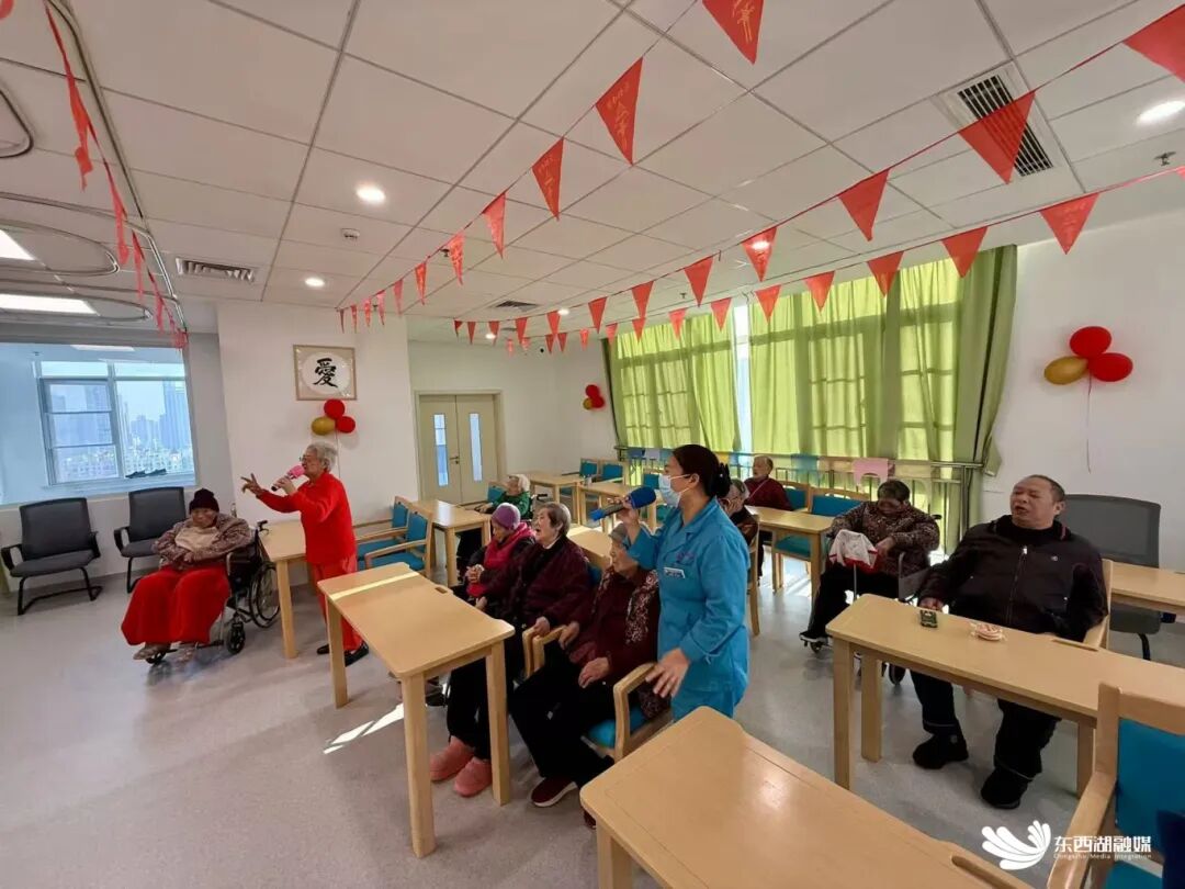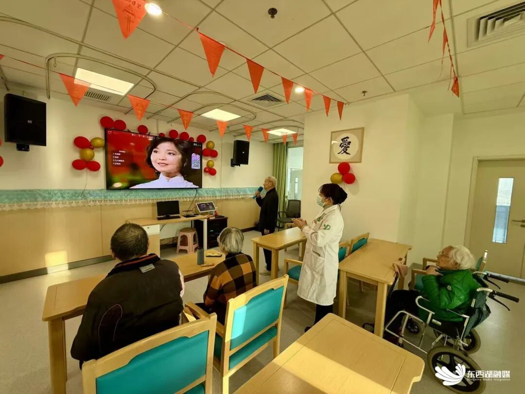 护工陪着老人,跟着节奏投入地唱着歌。