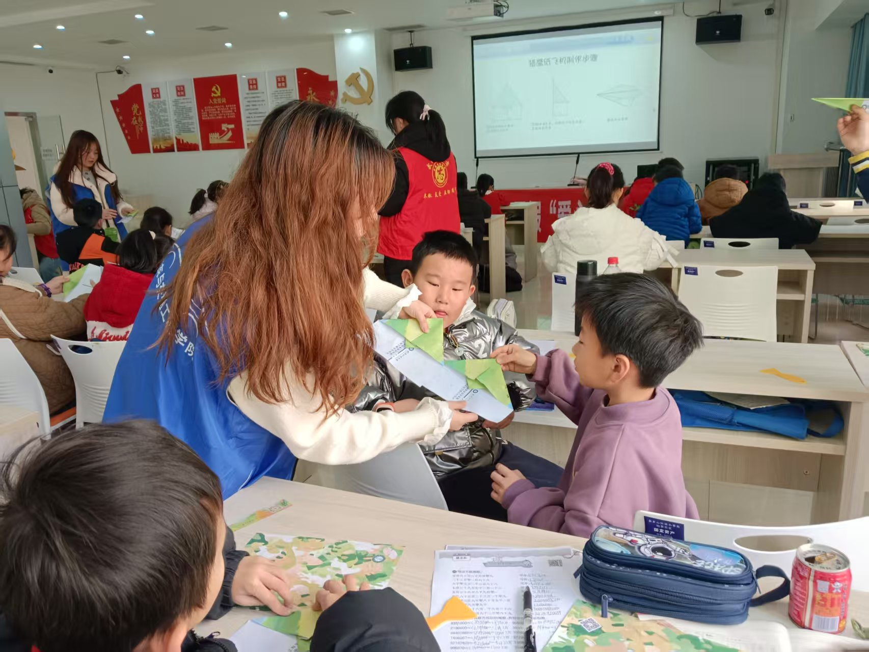 动手实践环节成为课程的高潮。志愿者们分步演示了三种纸飞机的折叠技巧,从纸张裁剪、折痕对齐到机翼调校,每一个细节都细致指导。孩子们专注投入,认真折叠、反复调整,遇到问题及时向志愿者请教。在志愿者的帮助下,一张张普通的A4纸逐渐变成了造型精美的纸飞机。随后的试飞环节中,孩子们拿着自己的作品,相互比拼飞行距离,现场欢呼声、喝彩声此起彼伏,大家在实践中直观感受科学原理的应用,体验动手创作的乐趣。