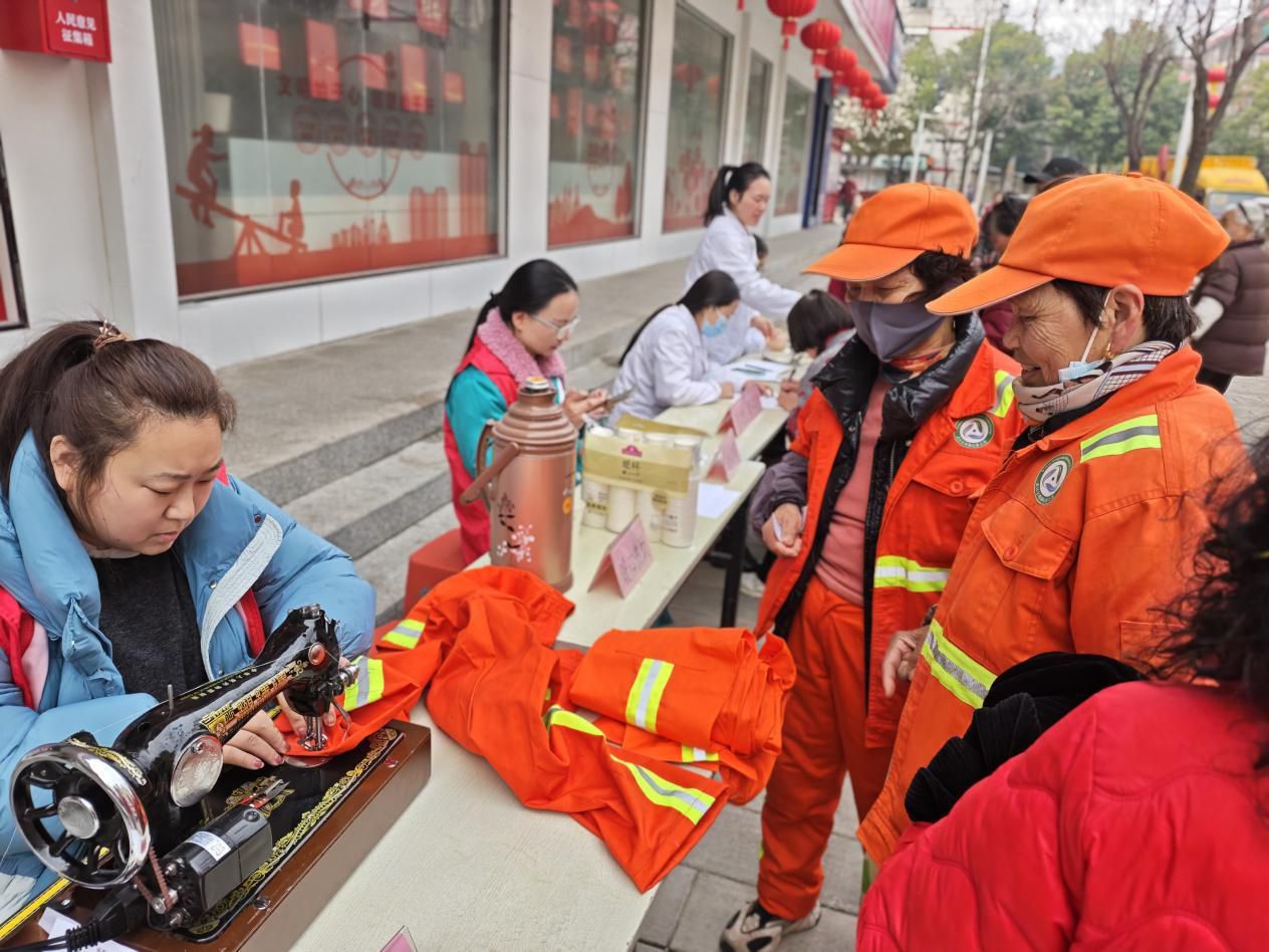 街卫生院医护志愿者带来爱心义诊,为居民测血压、查心率,对65岁以上老年人进行免费体检登记,细致解答健康咨询,普及慢病管理、春季养生知识,把专业医疗服务送到居民身边。缝纫、磨刀修鞋摊位上,志愿者们将破损衣物修补完整、把钝刀磨得锃亮,居民刘阿姨感慨:“妈妈八十岁了牙口不好,把刀磨快了可以把菜剁得碎碎的。”