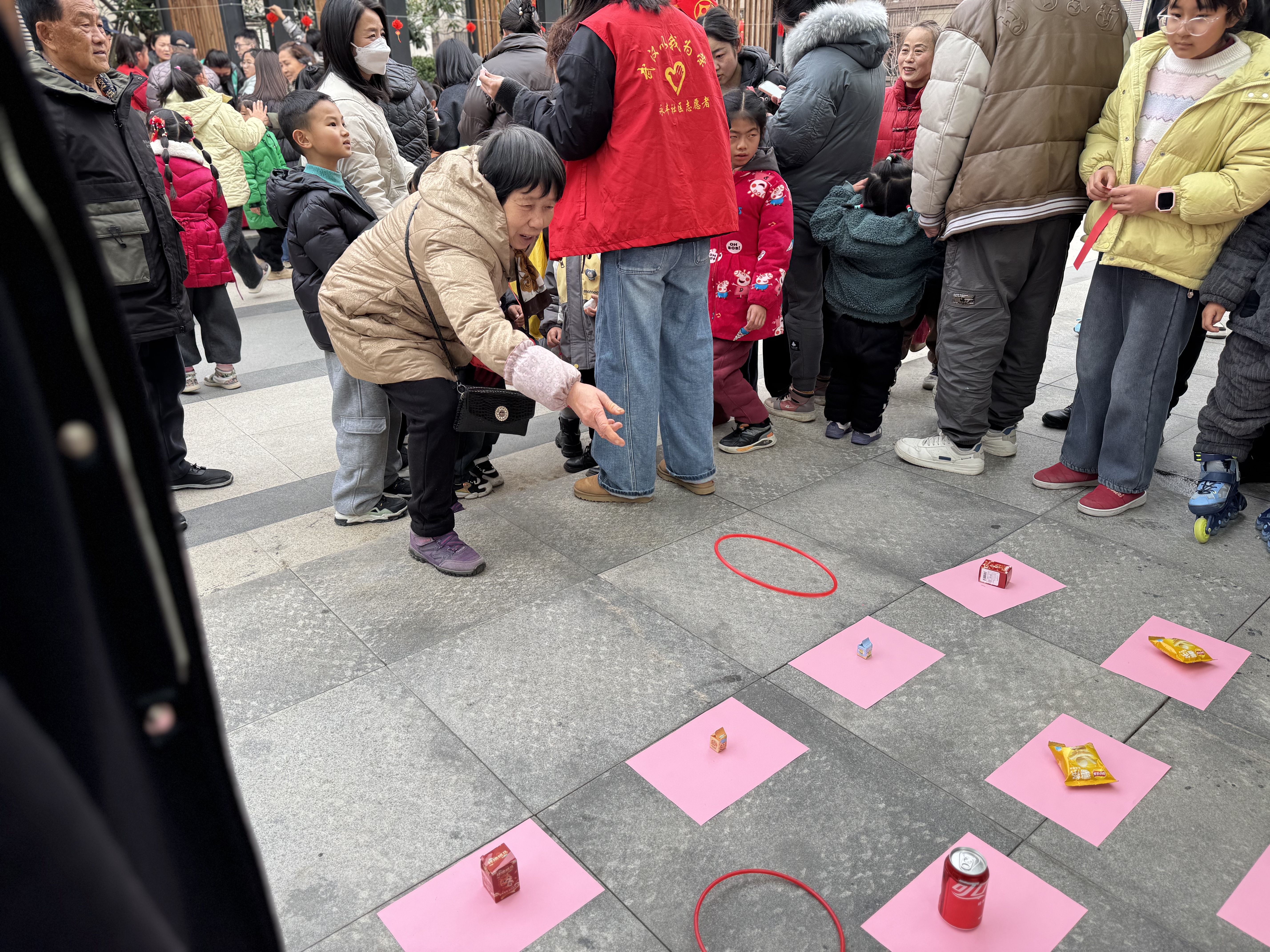 套圈赢礼品区域前,居民们排起长队,瞄准目标、果断出手,一个个套圈在空中划过弧线,满载而归的居民脸上写满喜悦。