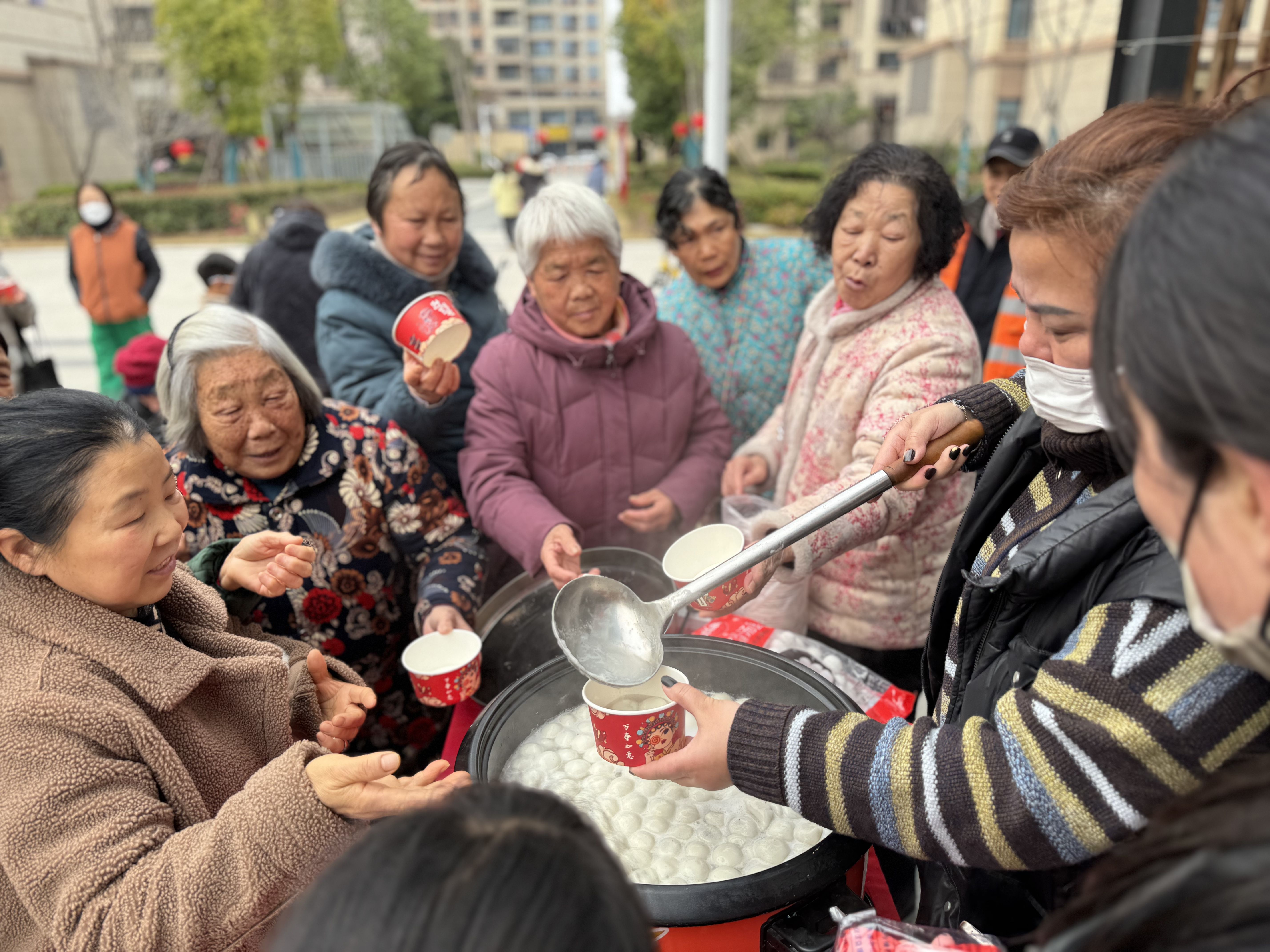 香甜的元宵出锅了、端上桌,居民们围坐在一起,品尝元宵,唠着家常,分享生活趣事。