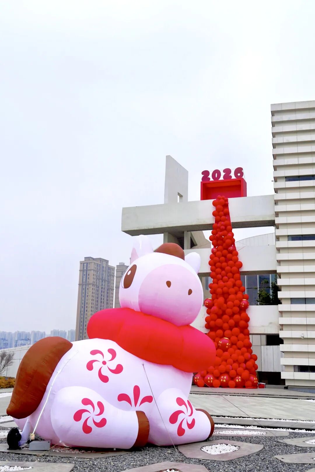 楼顶巨型“提福小马”憨态可掬,手提大红“福”字,为到访市民送上新春祝福。中心花园内,一匹纯白灵动的“樱花福马”头戴粉色花环,与初显生机的春意相映成趣,这里因此成了热门打卡点。此外,影城旋转楼梯上,红色灯笼从标注“2026”的礼盒造型中涌出,如瀑布般倾泻而下,寓意新的一年红红火火。