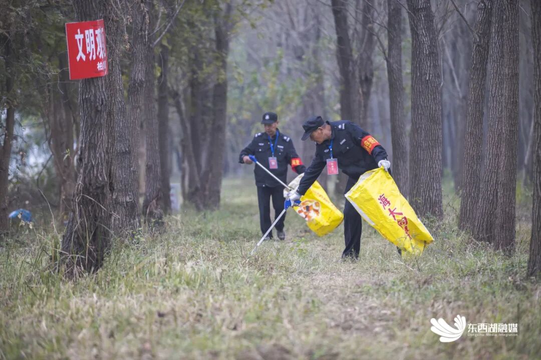 巡护队成员沿途捡拾垃圾,保护候鸟栖息环境不受破坏。