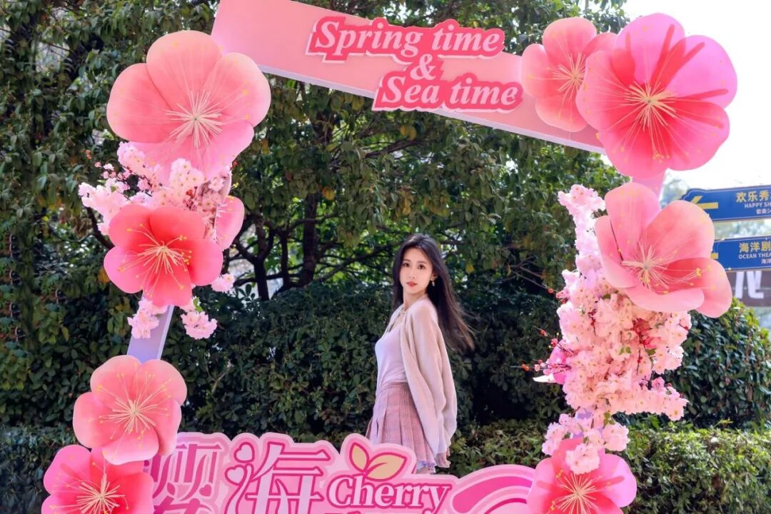 樱花在公园入口处,可以以樱花树为前景,将“海合安极地海洋公园”标志性大门或卡通雕塑框入画面,营造欢快入园氛围。