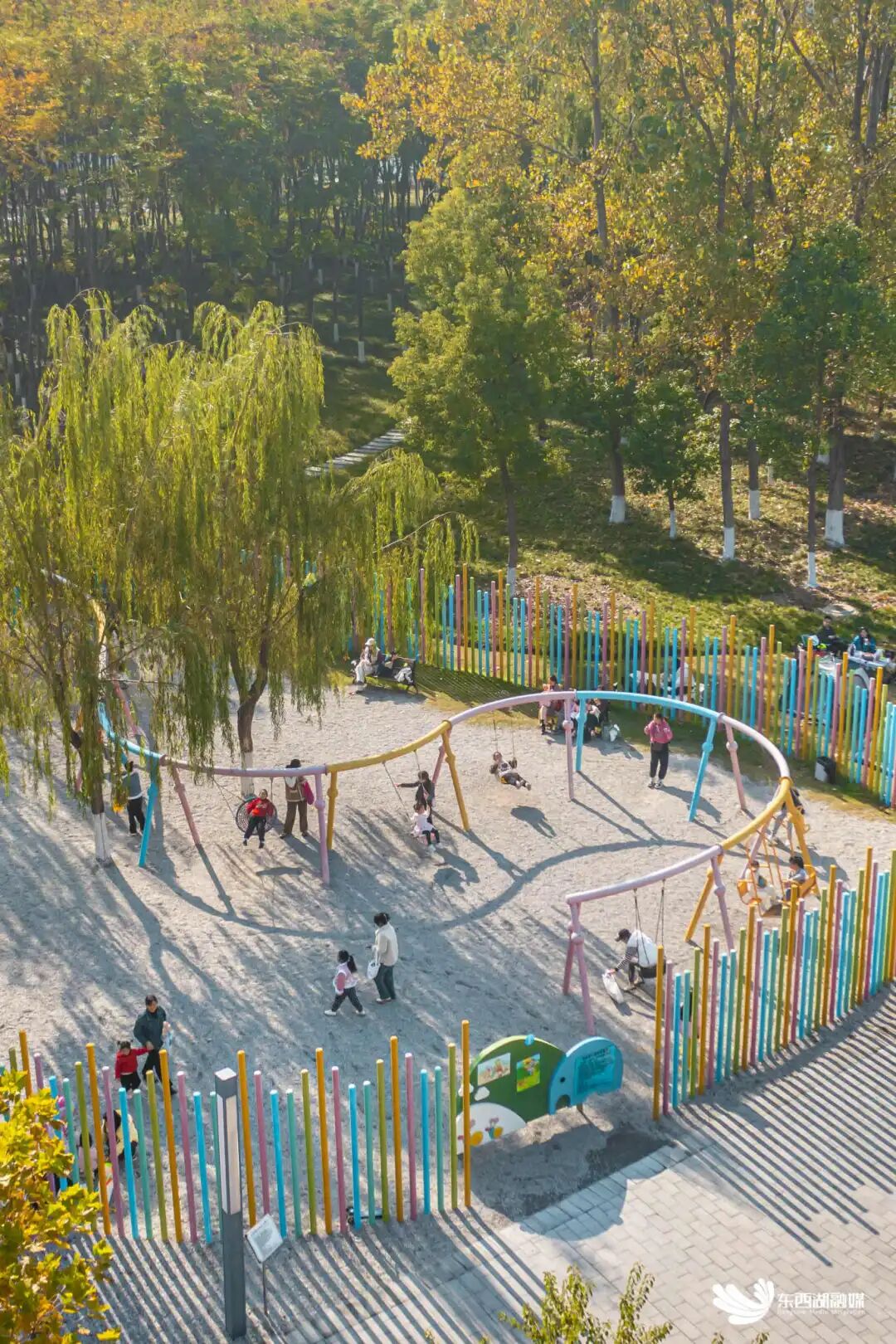 在金银潭公园西侧后方,有一座五彩斑斓、造型萌趣的“丛林秋千”。秋千的百米开外,还有一座大型的封闭式蹦床阵,是小朋友们向往的童趣乐园。