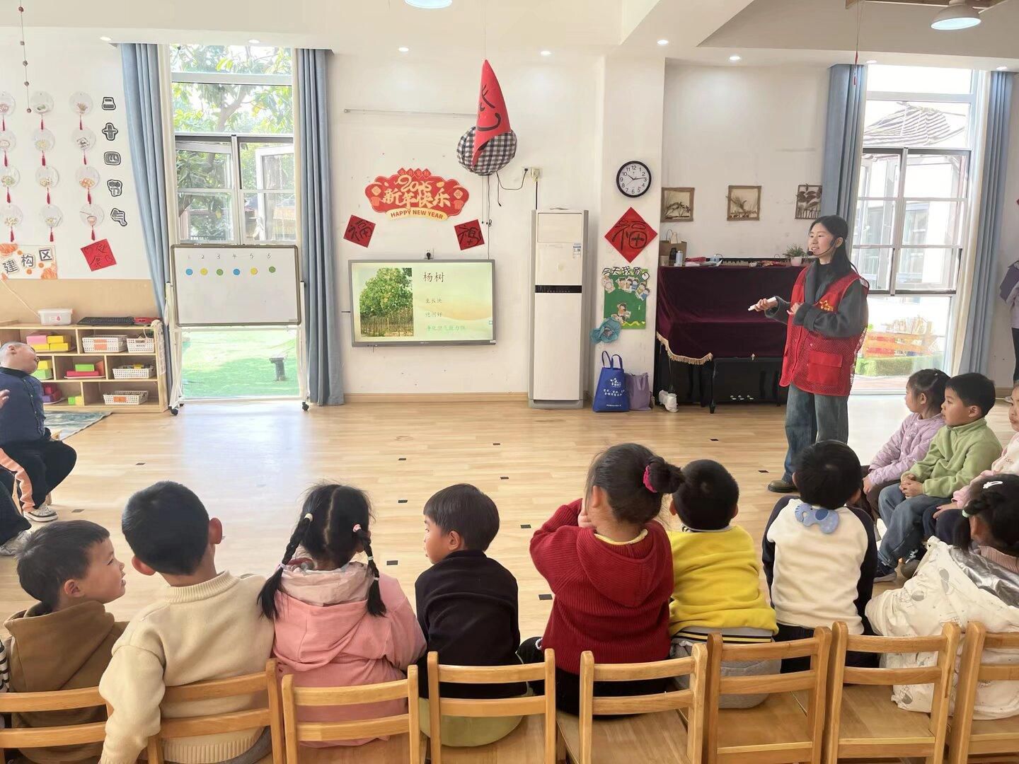 在“认识树木”环节,志愿者展示松柏、梧桐、银杏等常见树木图片,引导孩子们观察树木特征,通过故事讲述植树节由来,揭示树木对净化空气、涵养水源的重要意义。
