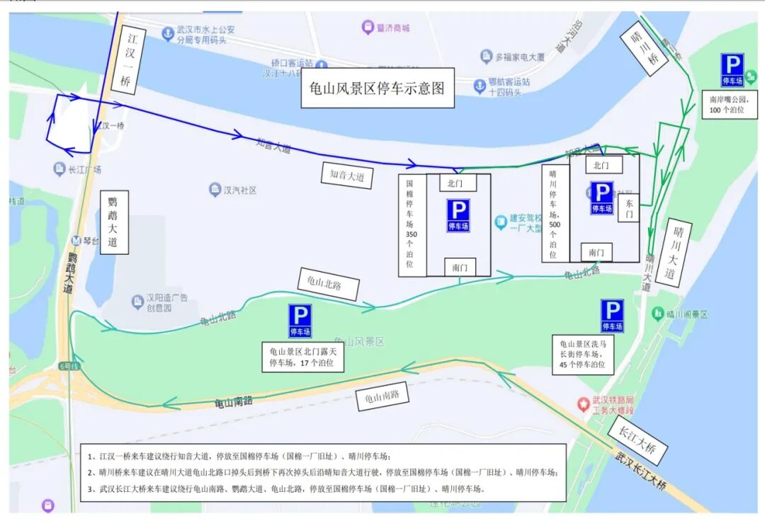 1.江汉一桥来车:建议绕行知音大道,停放国棉停车场或晴川停车场。