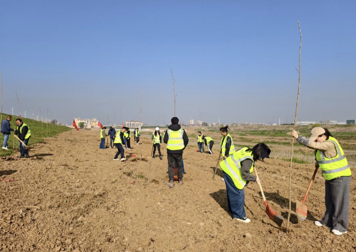 3月11日上午,首场植树活动在东山东风垸堤举行。局党组书记、局长詹辉带领全局160余名干部职工,现场栽植丹红杨扦插苗2000余棵,为东风垸堤防浪林增添新绿。植树现场热火朝天,大家三五成组,扶苗、培土、浇水,配合默契。几位来自东山堤防所的老专家穿梭其间,手把手向年轻职工传授扦插技巧:“丹红杨入土三分之二,踩实后再浇水,成活率才高。”