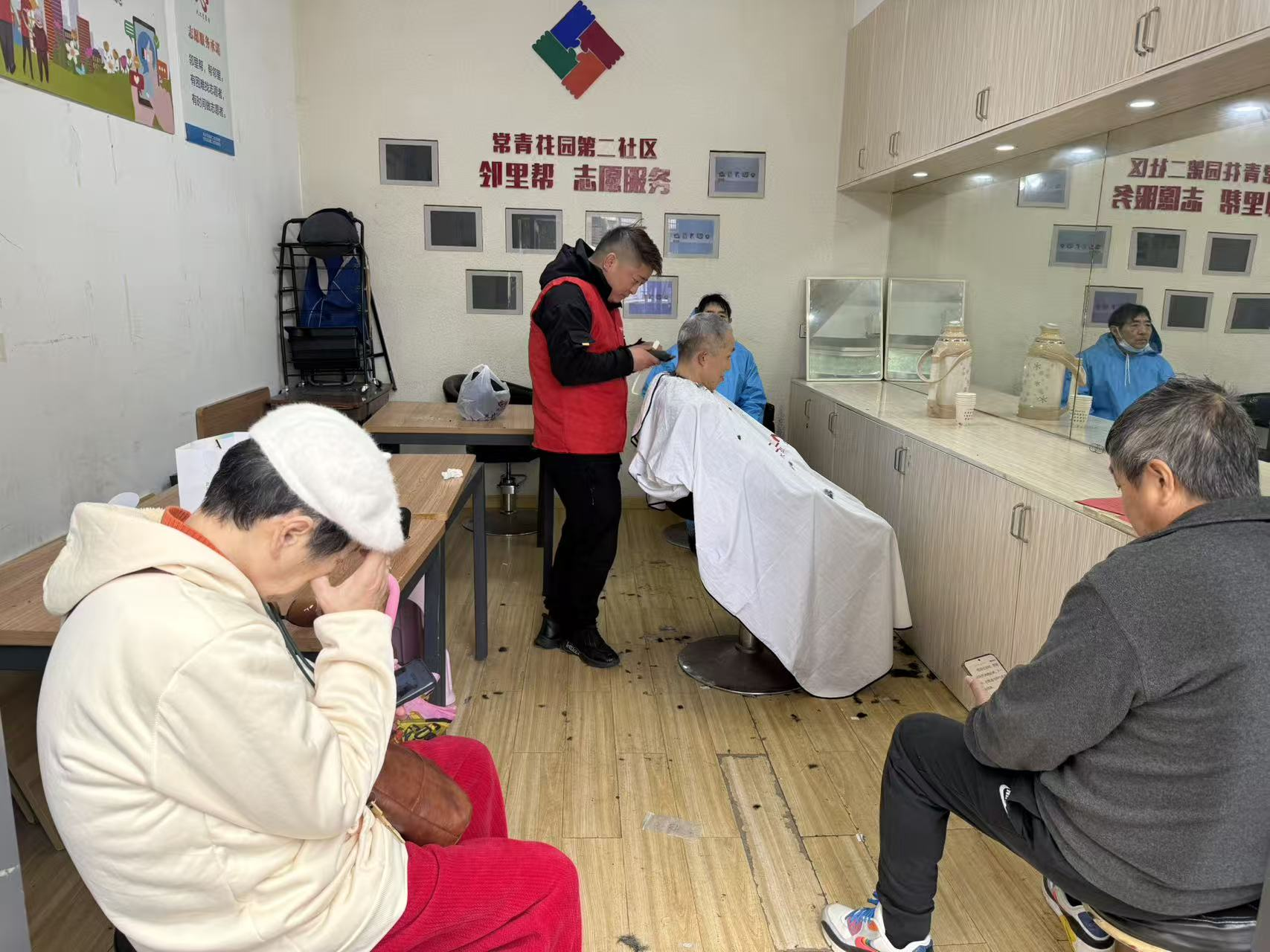 活动现场,社区志愿者与专业理发师细心布置场地、有序引导居民排队,耐心询问理发需求,认真细致修剪发型。