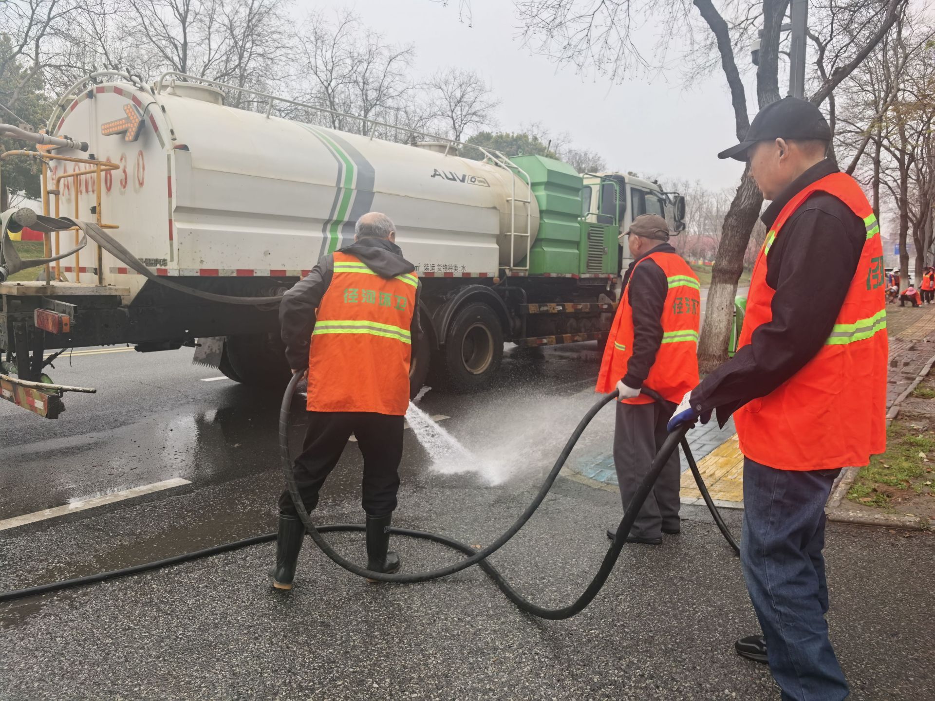 环卫工人冲洗路面
