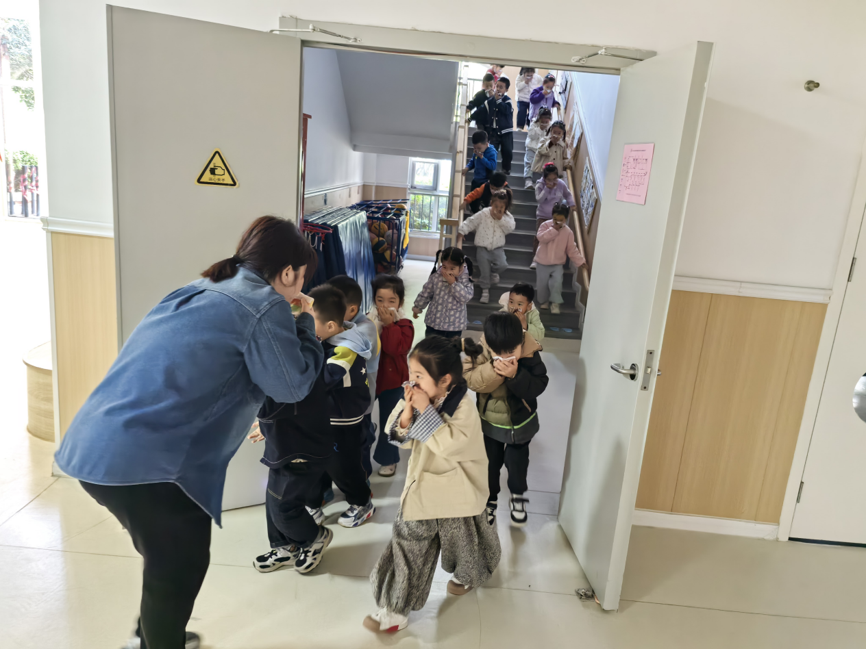 演练警报响起后,各班教师立即引导幼儿用湿毛巾捂住口鼻、弯腰低姿前行,严格按照预设疏散路线快速、有序撤离。孩子们听从指令、规范配合,在教师护送下安全抵达户外集结点,整个疏散流程紧凑高效、秩序井然,以实操行动践行“同心护安”的党建守护理念。