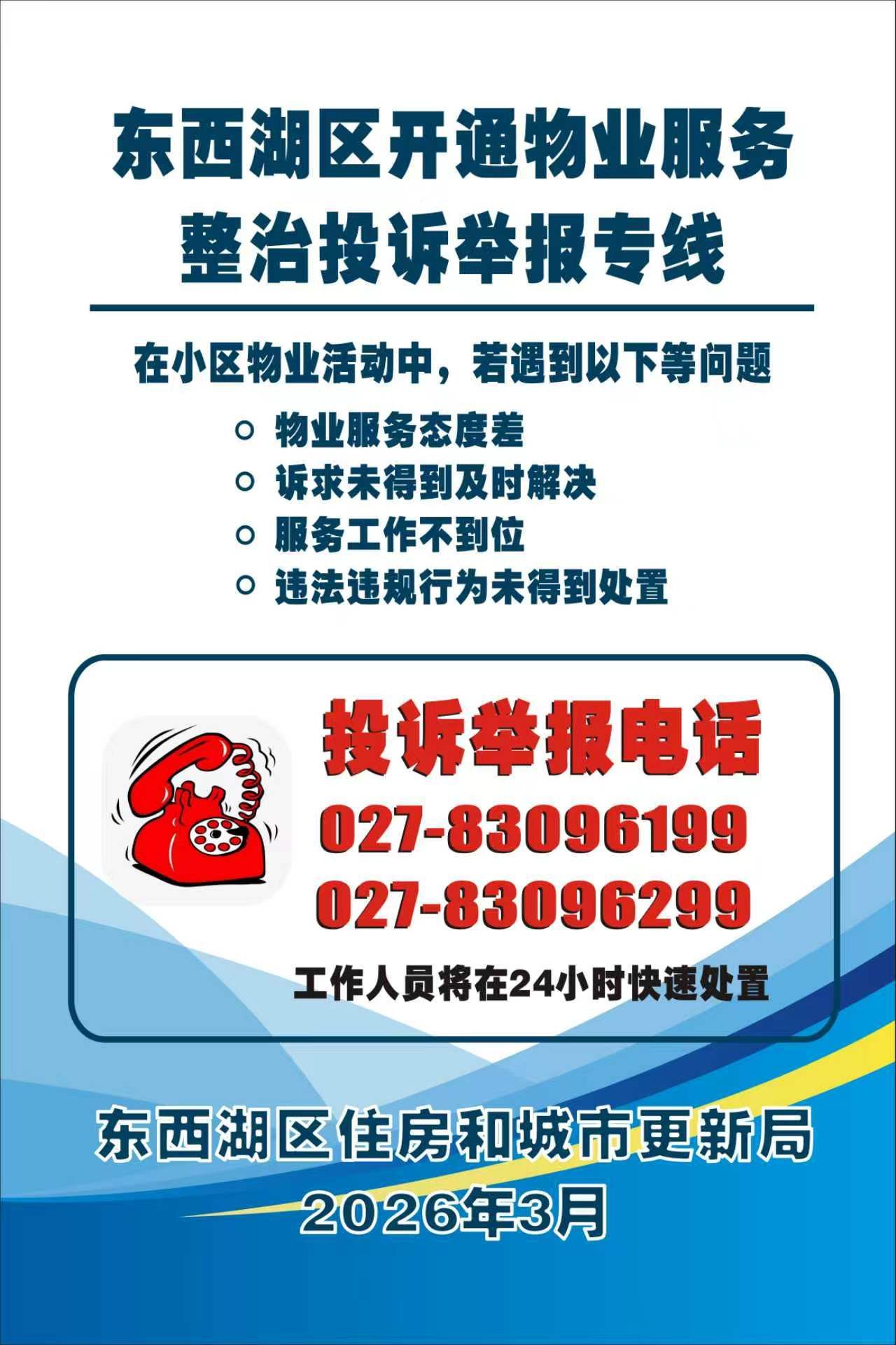 为深入推进物业服务领域突出问题专项整治,切实解决群众“急难愁盼”问题,东西湖区住房和城市更新局于2026年3月正式开通物业服务领域突出问题专项整治投诉举报专线:027-83096199、027-83096299。