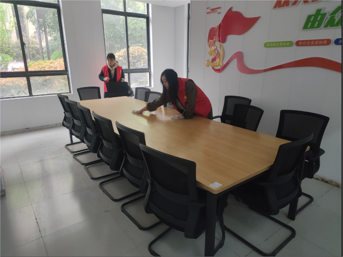 4月2日上午,怡景社区组织工作人员与志愿者,对怡华逸天地党群驿站开展全方位清洁行动。大家对驿站门窗、桌椅、宣传栏、便民设施等进行细致擦拭与消毒,全面清扫地面污渍、清理卫生死角,让党群驿站窗明几净、秩序井然,为居民打造了整洁舒适的活动空间,进一步提升了党群阵地服务效能。