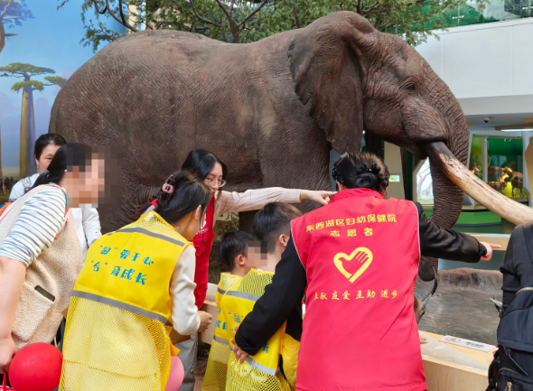 随后,孩子们走进贝林大河生命馆,在志愿者与康复师的陪伴下,近距离观察全球仅存两件的非洲草原象标本、会“劈叉喝水”的长颈鹿等珍贵展品,打开感官与认知的大门。