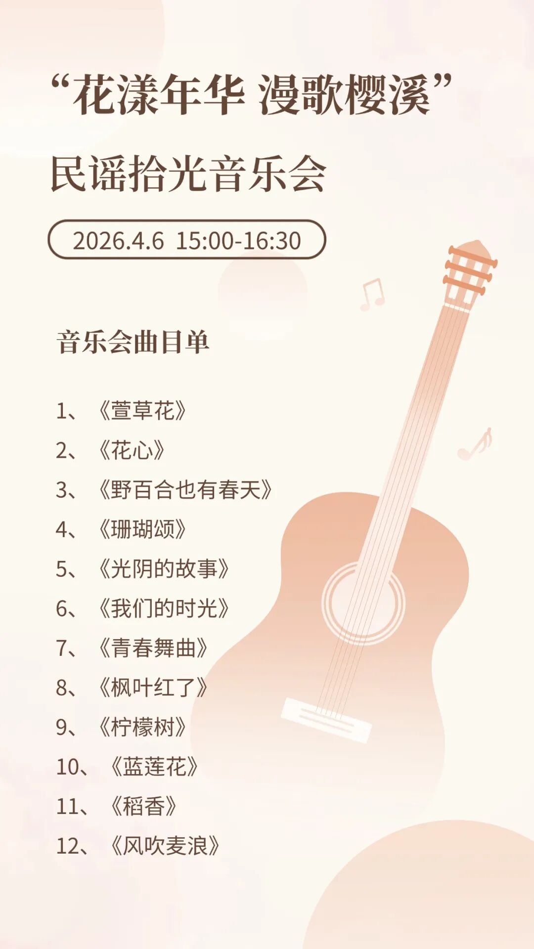 活动主题:“花漾年华 漫歌樱溪”民谣拾光音乐会。