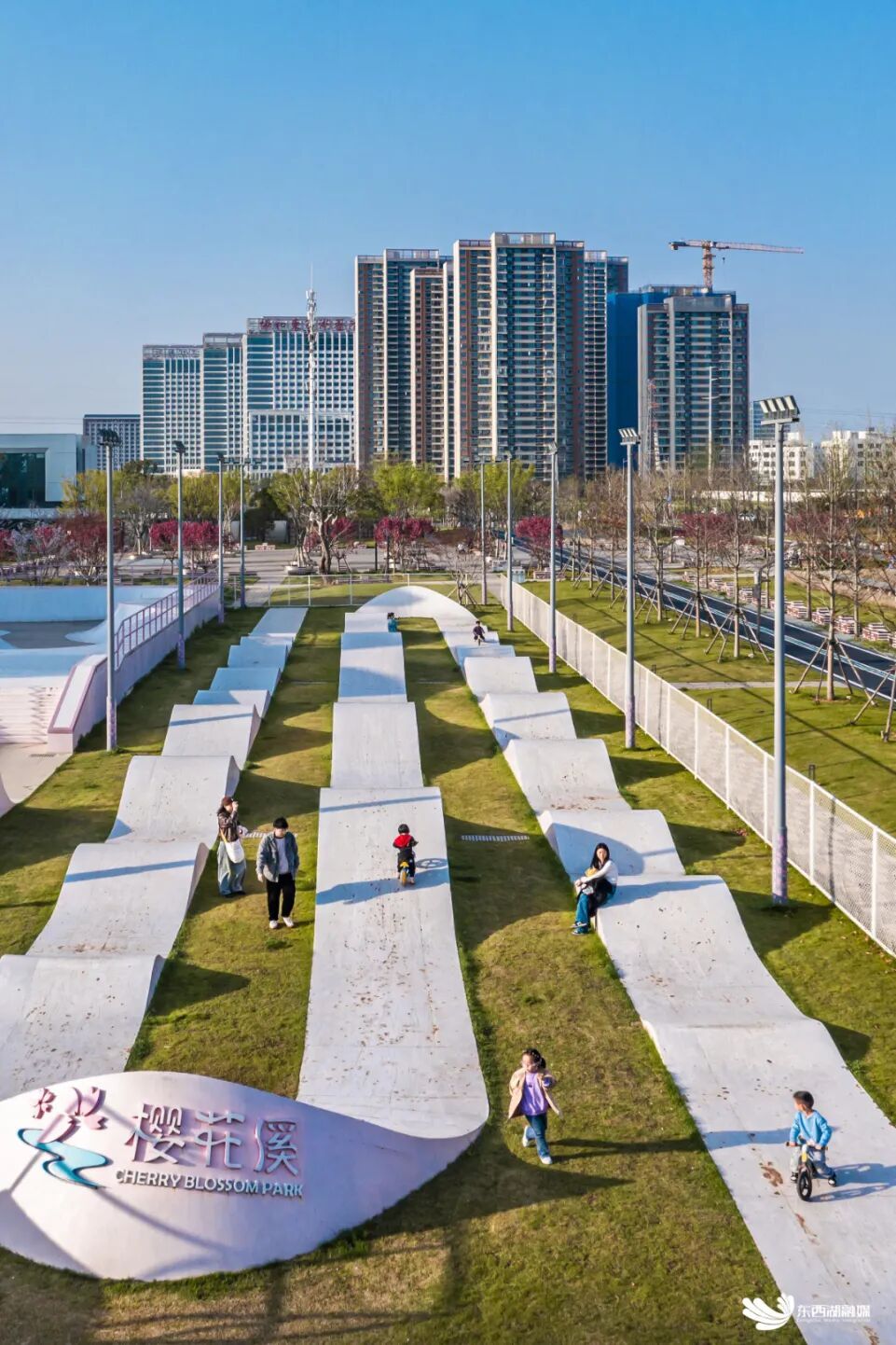 现在的樱花溪也就成了街坊们居家休闲的首选地,溪岸两侧的大草坪上,一到周末就搭满了五颜六色的露营帐篷,大人铺着野餐垫聊天,孩子追着风筝跑,还有不少骑行爱好者沿着绿道慢悠悠地晃。咕噜滑行公园更藏着满格年轻活力,公园专门设有极限泵道、滑板碗池等专业运动场地,不管是玩长板、陆冲的资深玩家,还是练平衡车的小朋友,都能找到适配的区域撒野。