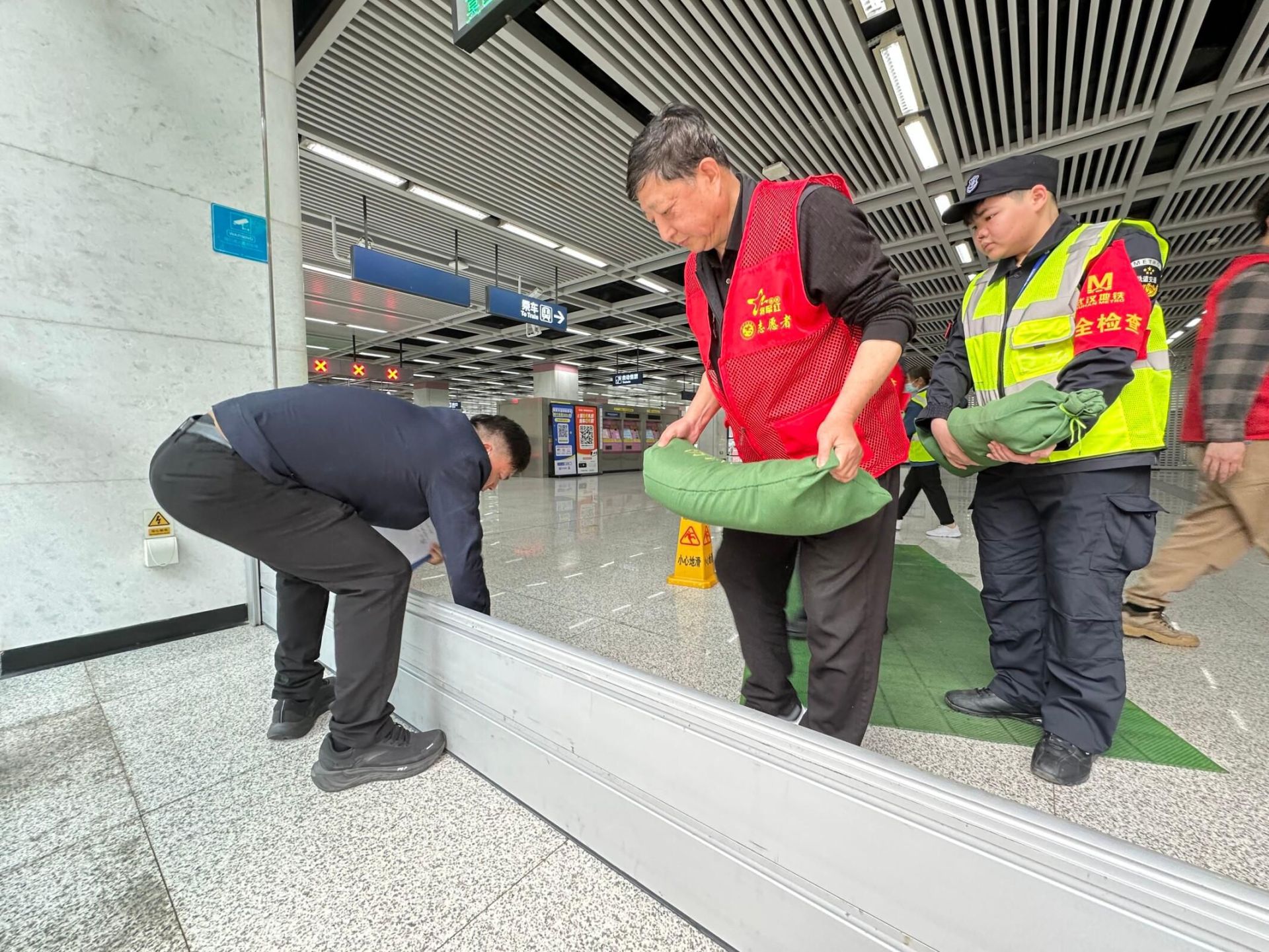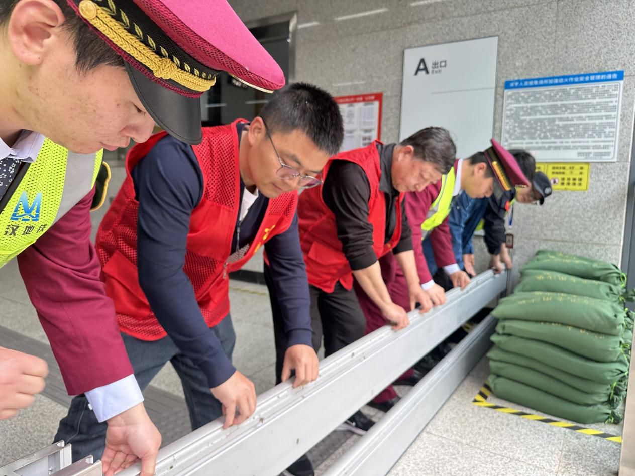 接到预警后,社区、物业及退役军人志愿队迅速响应,第一时间启动防内涝应急预案,各应急小组分工明确、协同作战:抢险救援组火速抵达现场,设置警示标识、清理排水设施、堆砌防水沙袋、安装防洪挡板,对积水区域开展封堵与抽排作业;疏散引导组有序引导站内乘客及周边居民安全撤离;后勤保障组全力做好物资供应与人员调配,确保抢险工作高效推进。