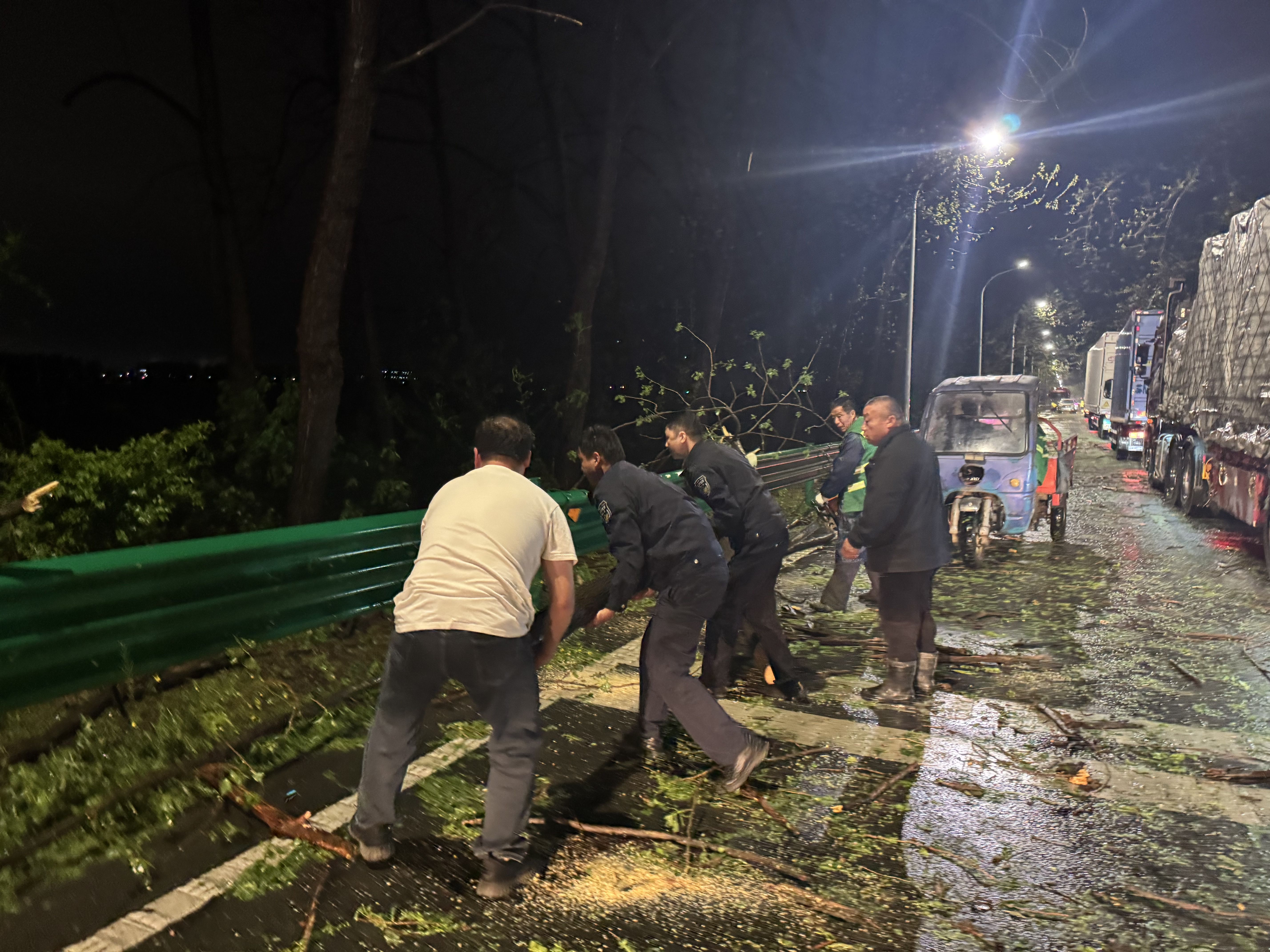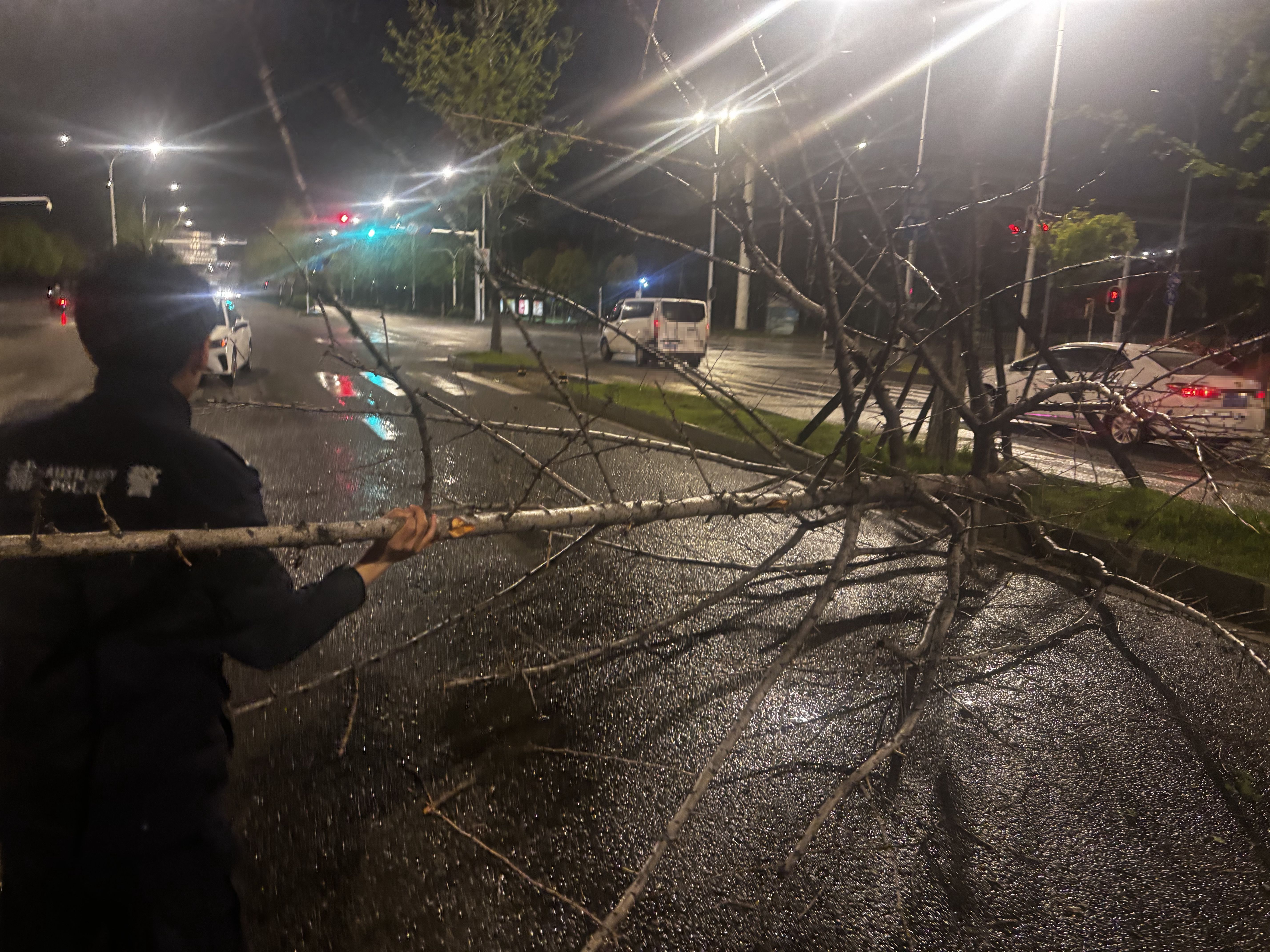 处置完这起求助后,民警吴凌昭驾驶警车返回派出所途中,发现道路旁绿化带的树木被狂风暴雨拦腰折断,粗壮的树干横躺在马路中间,险些引发交通事故。民警立即下车,组织周边的热心群众,合力将断裂树木一步步挪到路边安全处。隐患消除,道路恢复畅通。