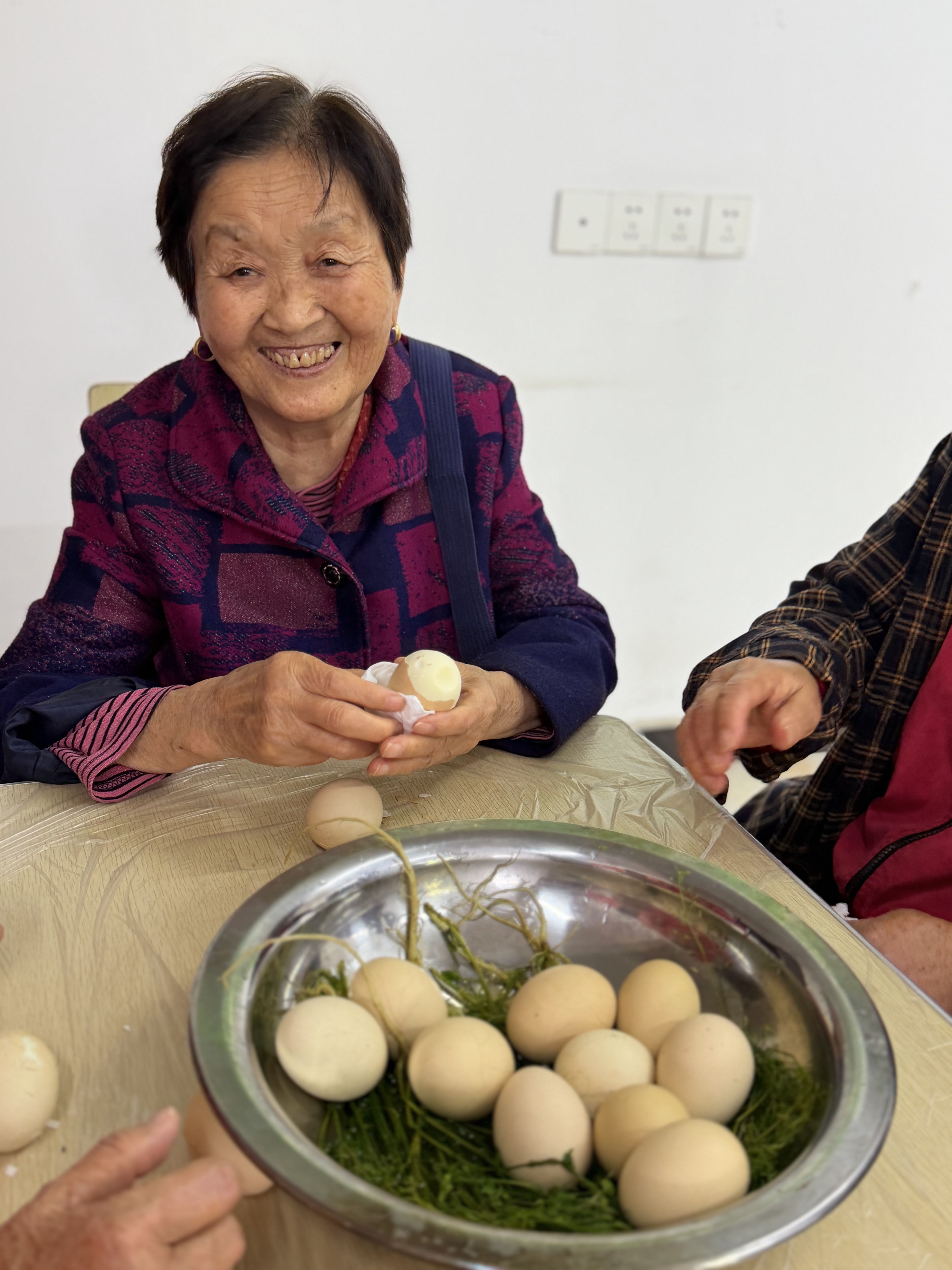 志愿者们将新鲜采摘的荠菜洗净、捆扎,与鸡蛋一同放入锅中,加入红枣、姜片,慢火熬煮。不一会儿,活动中心便弥漫着荠菜特有的清香。随着锅盖掀开,一个个温热的鸡蛋染上了浅浅的草绿色,格外诱人。老人们围坐在一起,边品尝软糯清香的鸡蛋,边聊着三月三的民间传说,现场欢声笑语不断。