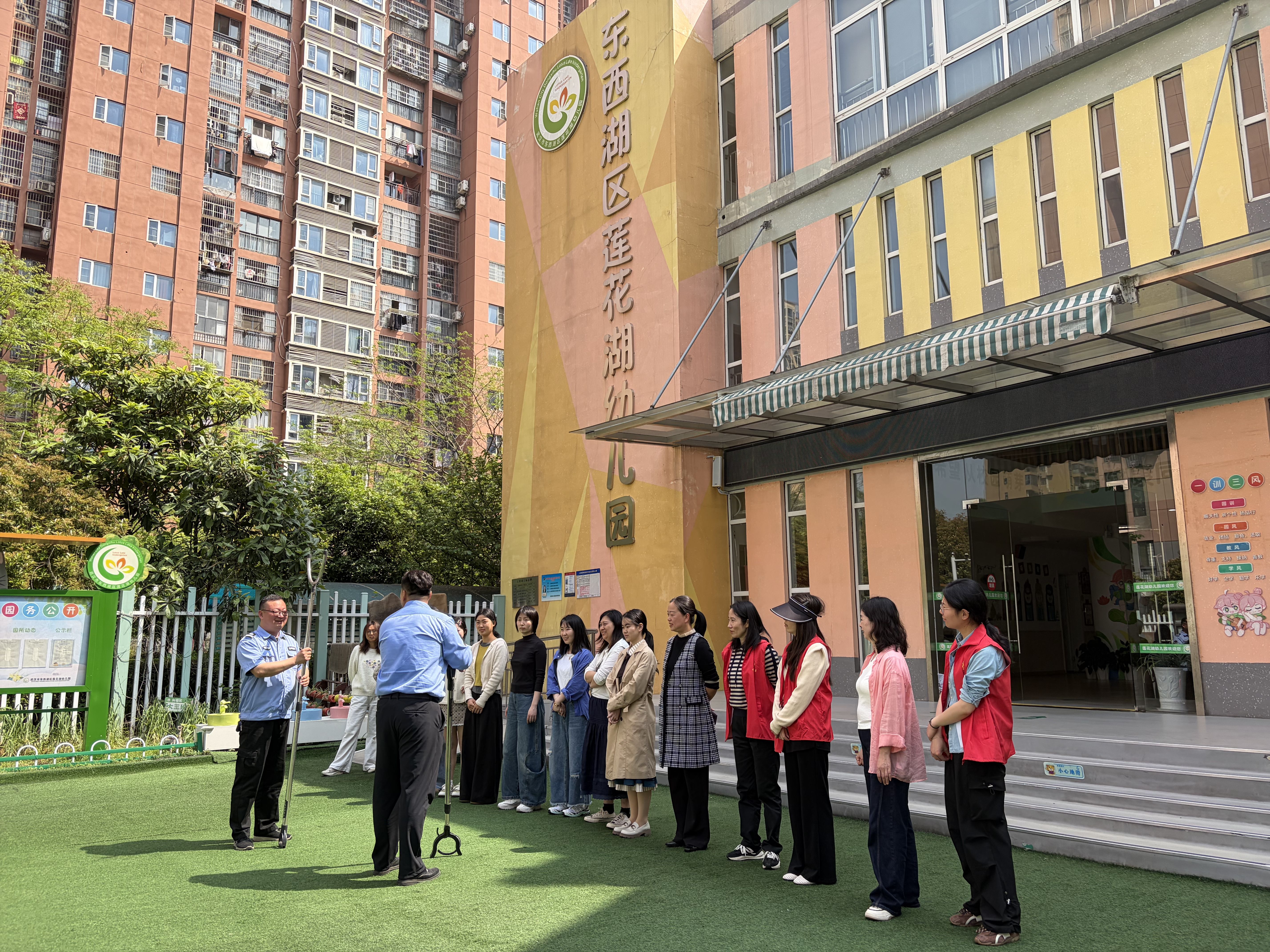 在防暴培训环节,社区志愿者与幼儿园教职工认真聆听了专业讲解。安全专员现场演示了防暴钢叉、长棍等器械的使用技巧,并系统讲解了突发暴力事件的识别方法、避险原则与处置流程。通过“手把手”教学,大家熟练掌握了器械使用与协同防护要点,应急处置能力得到有效提升。