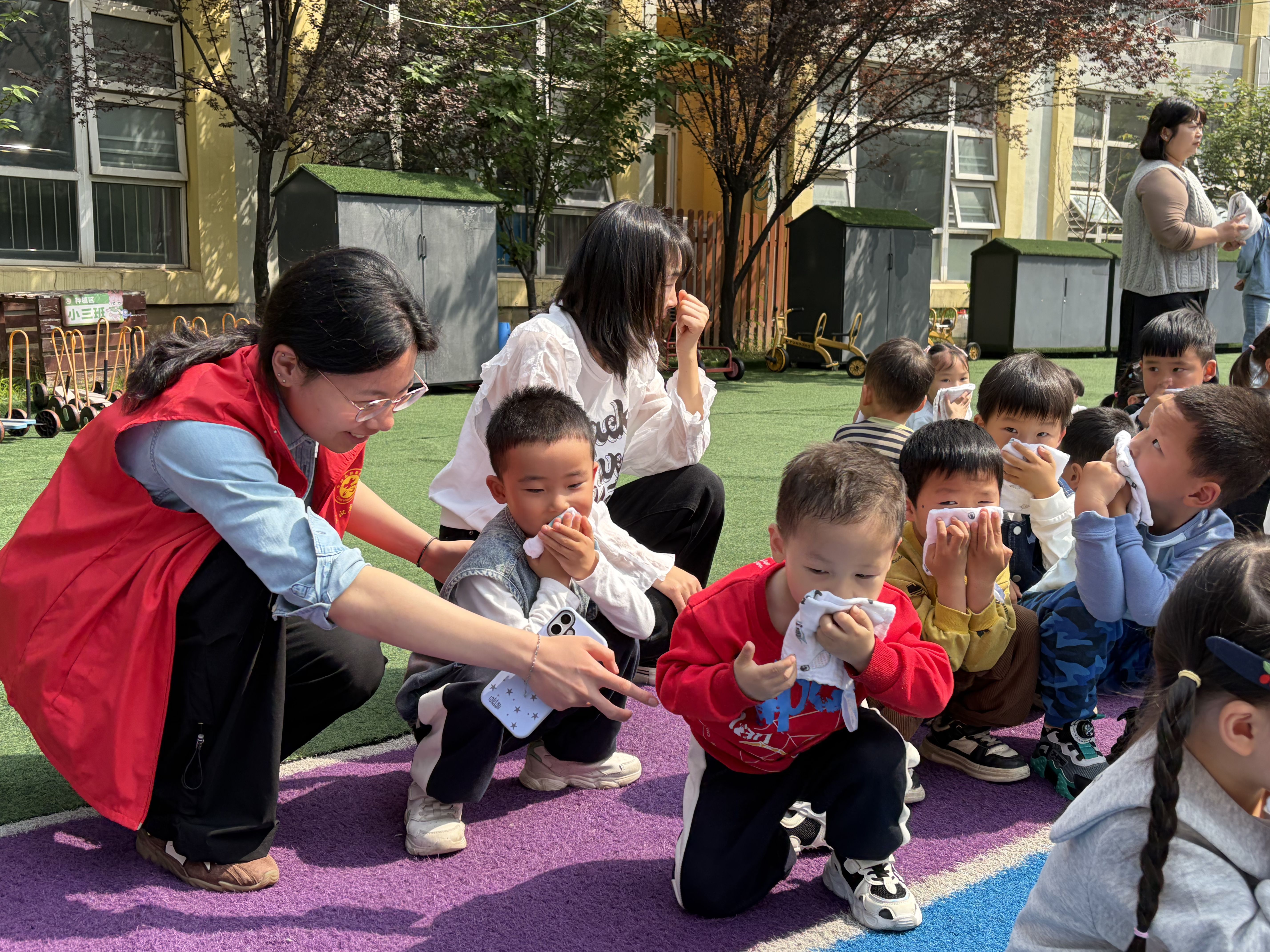 随着急促的警报声响起,消防疏散演练迅速启动。孩子们在老师与社区志愿者的引导下,迅速拿起湿毛巾捂住口鼻,弯腰低姿,沿提前规划的安全路线快速、有序地撤离至操场安全区。演练中,志愿者蹲身细心指导每个孩子规范动作,确保人人掌握逃生要领。随后,安全专员现场讲解了干粉灭火器“提、拔、握、压”的使用要点,并邀请幼儿代表参与实操,在志愿者全程协助下,孩子们手持灭火器对准火源根部喷射,亲身体验了灭火过程,掌握了基础的消防技能。