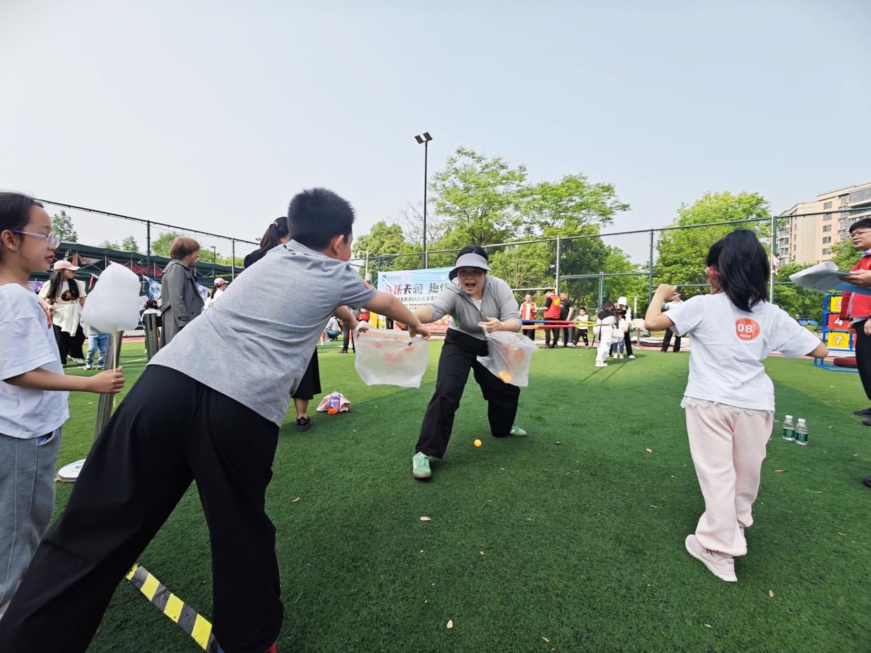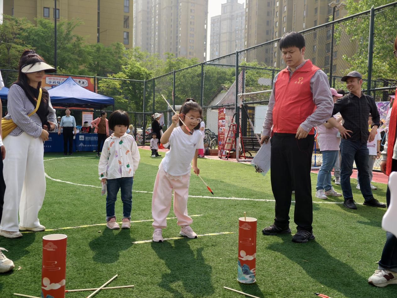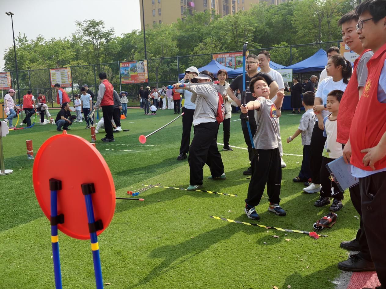 活动现场,春日阳光倾洒绿茵场,大家有序集结、活力满满。射箭、投壶等传统趣味项目尽显魅力,孩子们拉弓瞄准、举手投壶,家长们耐心指导、并肩参与,每一次精准命中都伴随着欢呼雀跃;“东西南北运球”“飞盘大作战”考验协作默契,大手牵小手穿梭奔跑,汗水与笑声交织成春日里动人的旋律;“摸石过河”项目中亲子们携手前行、相互鼓劲,在闯关挑战中感受团结的力量。